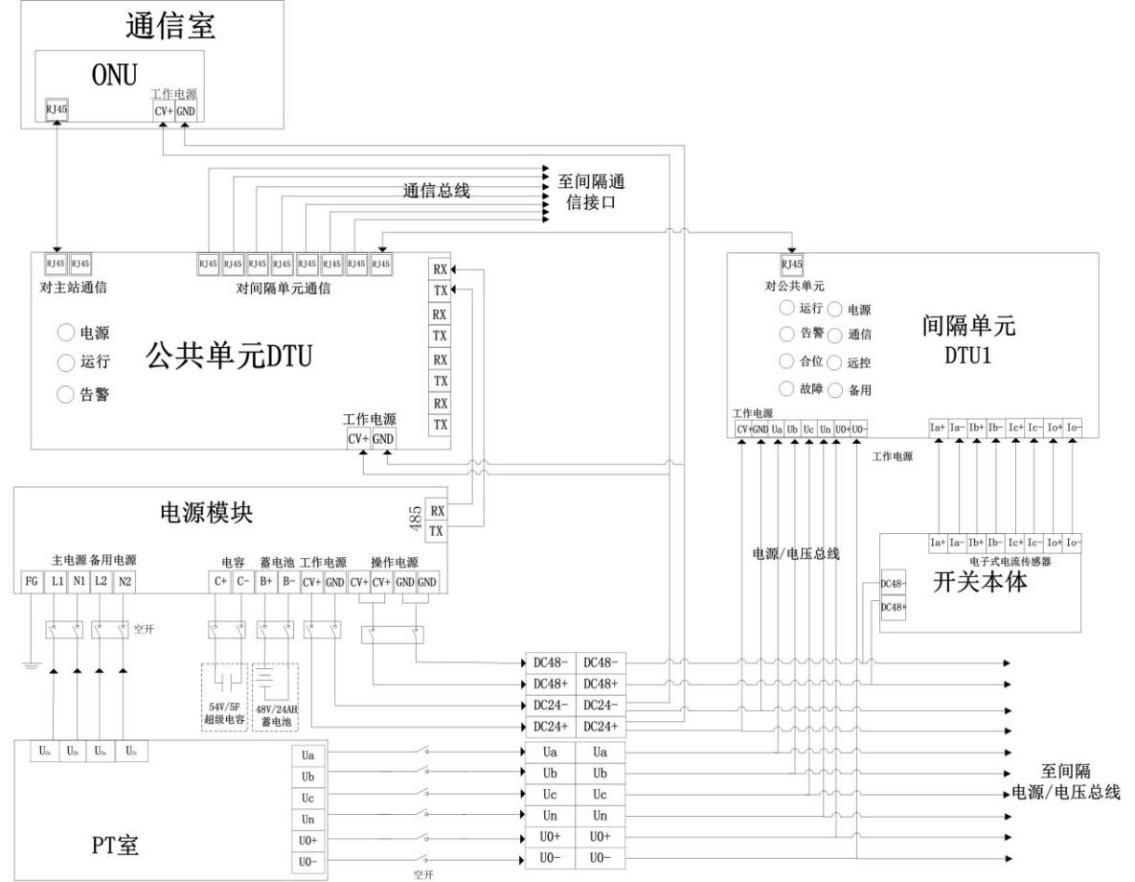 下圖為Enet490 DTU公共單元與Enet460 DTU間隔單元與開(kāi)關(guān)電氣原理圖。