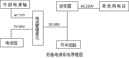 正常供電時(shí),由外部電源輸入,經(jīng)過(guò)電池管理單元提供開(kāi)關(guān)的控制和操作電源,同時(shí)經(jīng)過(guò)逆變器,給網(wǎng)絡(luò)設(shè)備、視頻等其他用電設(shè)備等供電。外部電源同時(shí)給電池組充電;外部電源失電時(shí),由電池組通過(guò)電池管理單元自動(dòng)接續(xù),給開(kāi)關(guān)回路和其他用電設(shè)備供電。