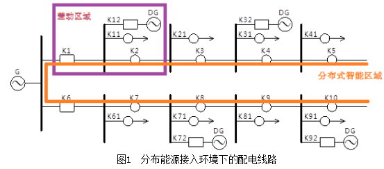 圖1是分布能源接入環(huán)境下的配電線路的典型結(jié)構(gòu)圖。引入?yún)^(qū)域差動(dòng)保護(hù)技術(shù)之后,保護(hù)定值針對(duì)一個(gè)區(qū)域,根據(jù)基爾霍夫電流定律,針對(duì)一個(gè)區(qū)域ΣI=0,理論上,任何環(huán)境下的區(qū)域保護(hù)定值都是0。實(shí)際的保護(hù)定值應(yīng)該是大于0的某一個(gè)值Id。這個(gè)Id和區(qū)域無(wú)關(guān),只和ΣI中各個(gè)分量采樣和計(jì)算誤差有關(guān)。亦即,常規(guī)型FA技術(shù)中,保護(hù)定值調(diào)整困難和無(wú)法設(shè)置的問(wèn)題在區(qū)域差動(dòng)保護(hù)技術(shù)完全不存在了。
