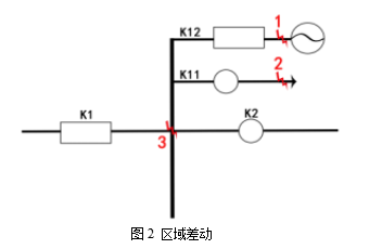 考慮圖2中的典型差動(dòng)區(qū)域,可能故障點(diǎn)有三處。位置1發(fā)生故障時(shí),K12速斷跳開(kāi),完成故障隔離。位置2發(fā)生故障時(shí),k12過(guò)流但方向閉鎖不跳,k11過(guò)流速斷跳開(kāi),完成故障隔離。