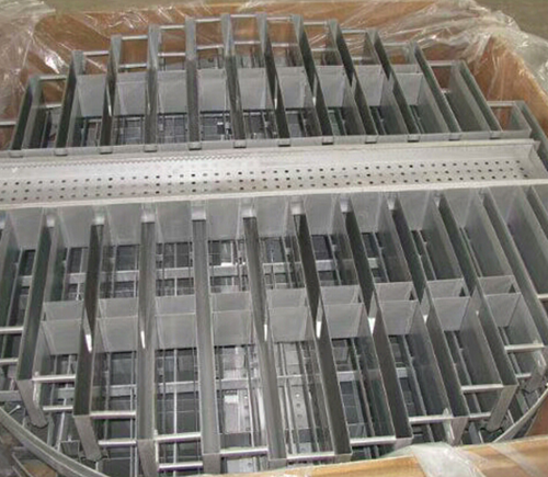 實現(xiàn)傾斜板對全截面的覆蓋,能夠?qū)σ后w收集時提升收集效率,這是柵板式支承-收集-再分布器的最Z大優(yōu)點,但是對于上升氣流的干擾以及高度的增加,會導(dǎo)致其性能受到一定程度的影響。因此,應(yīng)該采用合理的方式對柵板式支承-收集-再分布器進行改進。柵板支承絲網(wǎng)填料的過程中,液體受到上升氣流的影響,會通過塔壁四周流下。這是由于在網(wǎng)片中存在一定程度的毛細作用,加上上升氣流的上舉力作用,導(dǎo)致液體下落有在困難。為了有效對液體進行收集,需要采取合理的導(dǎo)流措施。為了便于液體分散落入分布槽中,可以將柵板下緣設(shè)計為鋸齒狀。液體沿內(nèi)壁流下后通過集液環(huán)由環(huán)形槽收集。多孔型和溢流型柵板式支承-收集-再分布器的設(shè)計,能夠分別在小流量和大流量操作中提升工作效率。